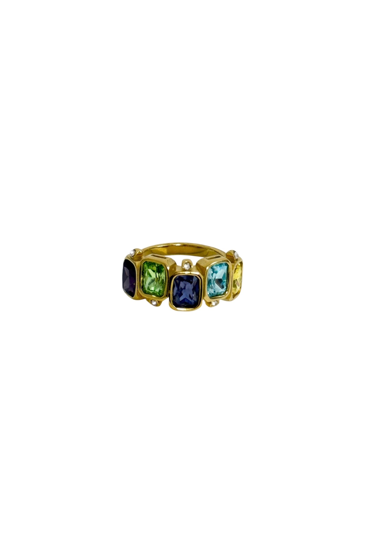 Anel em aço inoxidável com 6 zircónias quadradas coloridas e zircónias redondas.